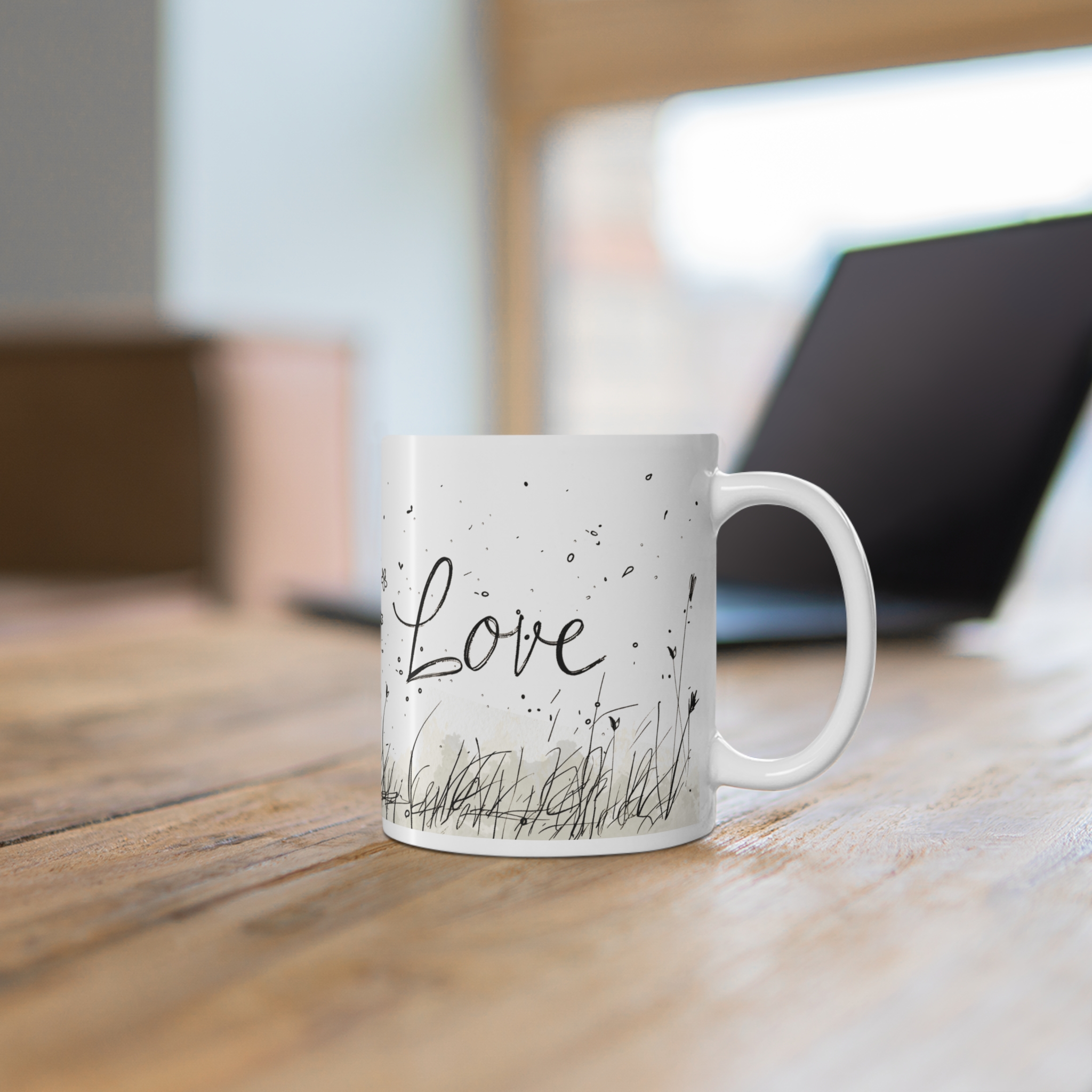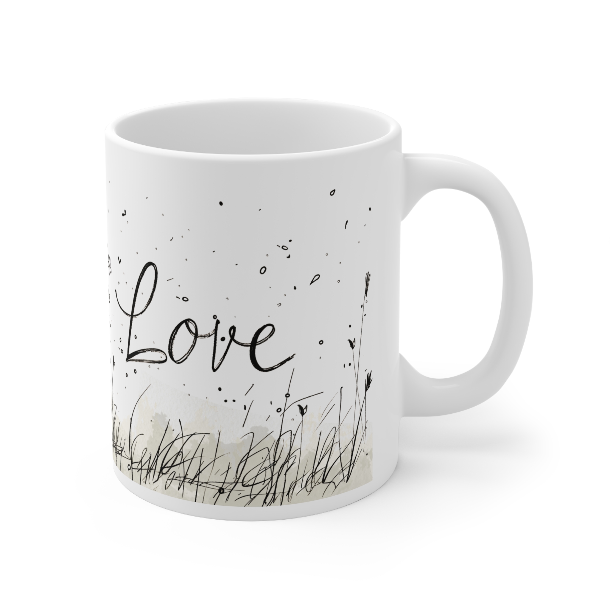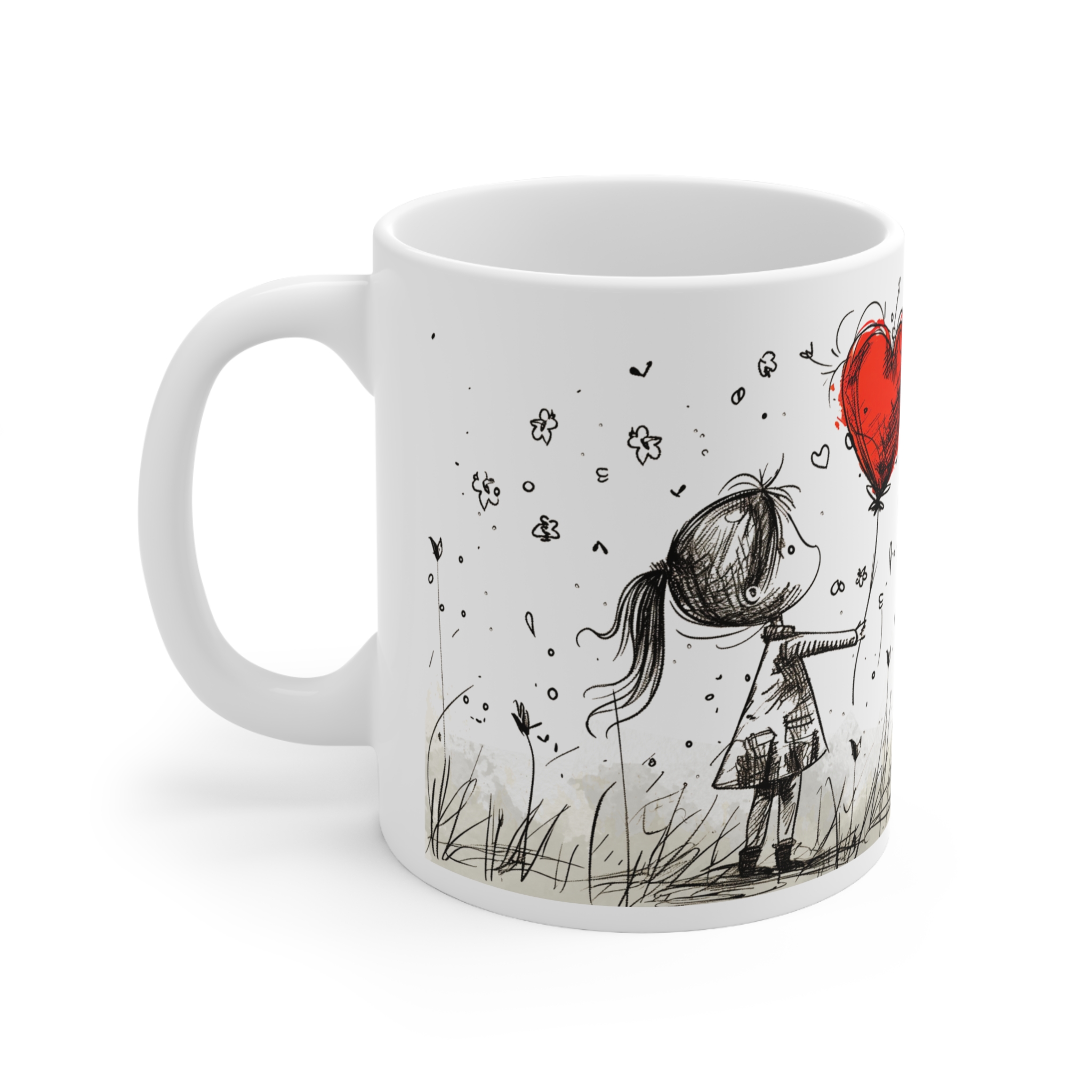 This glossy white ceramic mug carries a gentle, storybook charm — a sketched little girl reaching up to a bright red heart-shaped balloon as tiny flowers and birds dance around her. The soft monochrome linework gives the scene a hand-drawn warmth, while the splash of red brings a quiet, emotional pop. Comfortable to hold and easy to care for, this mug becomes part of slow mornings, handwritten notes, and shared conversations. It’s the sort of cup you reach for when you want a moment of calm, a memory stirred, or a small, heartfelt gesture to accompany your coffee or tea.